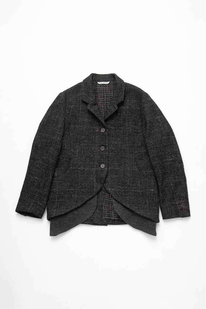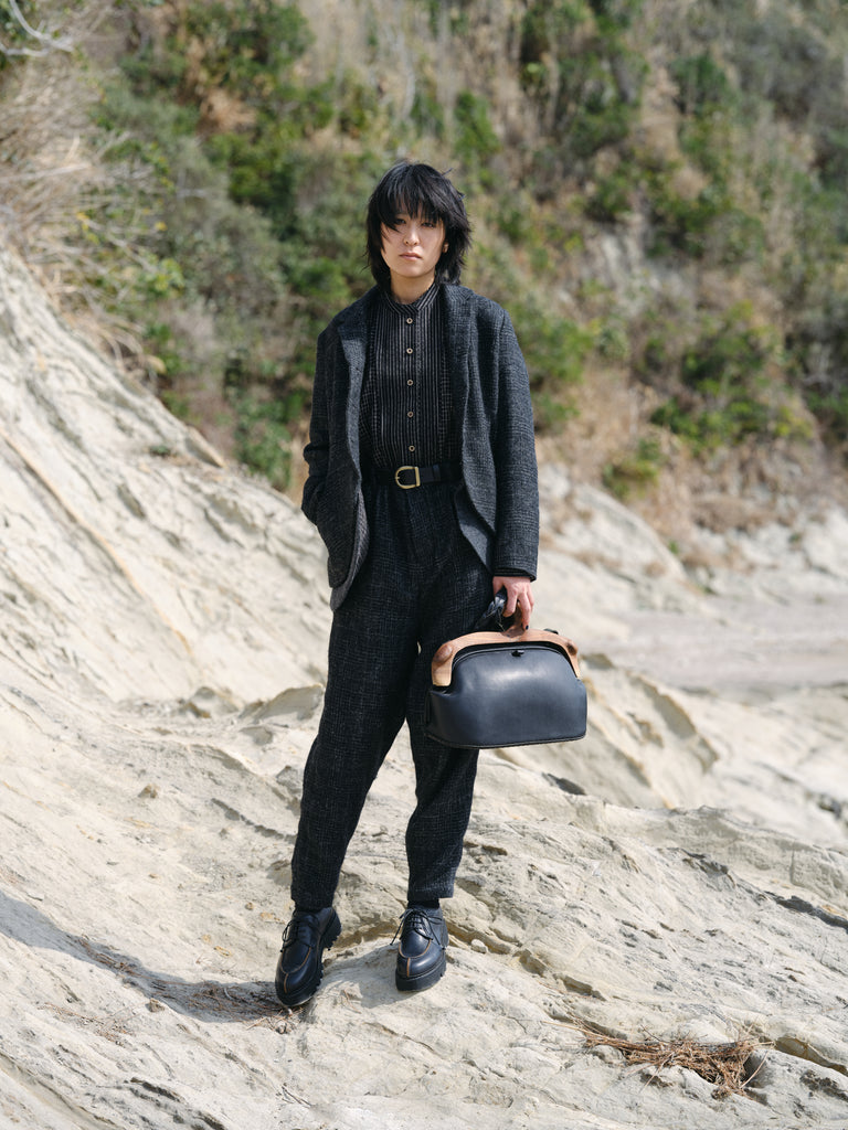 尾州の生地メーカー〈オフィスクニ〉の麻糸を織り交ぜた毛織物と、浜松で遠州織をつくる〈杉浦テキスタイル〉の手織りのようなコットンを組み合わせて使用していて、異なる素材の質感が重なり合って奥行きのある表情が生まれました。