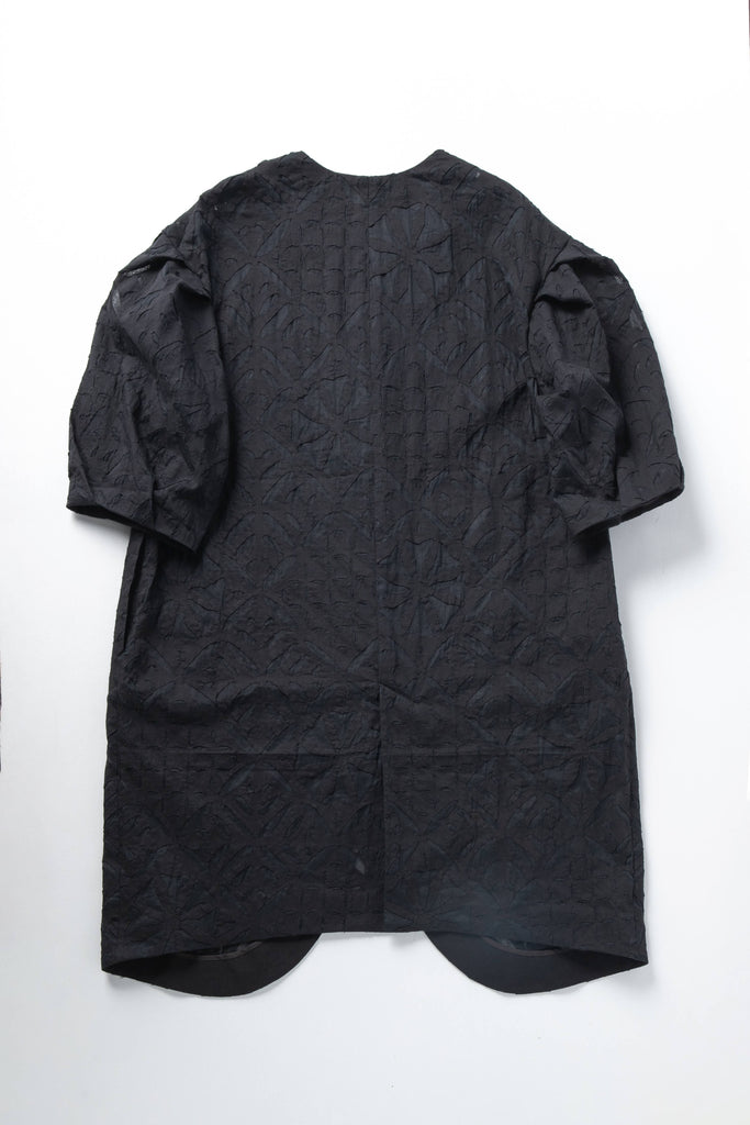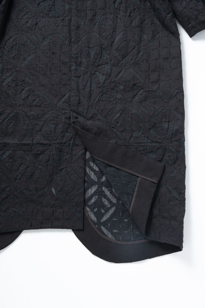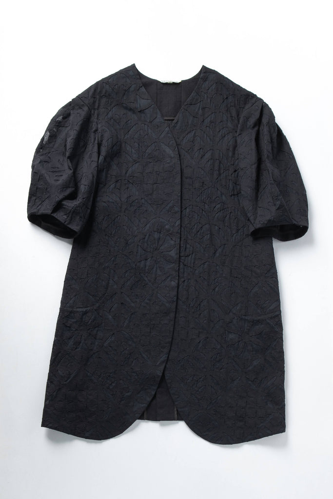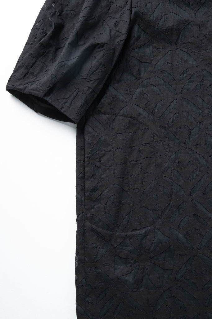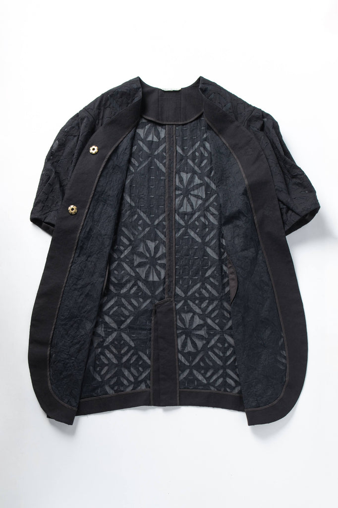 椿の種子をイメージした丸いフォルムの袖と、カットワークがもたらす素朴さと透け感がオーガニックな雰囲気を醸し出します。前開きには手付けのスナップボタン、一枚仕立てのサイドポケットは気にならないように本体に叩きつけてあり、縫い代は全てパイピング始末されています。