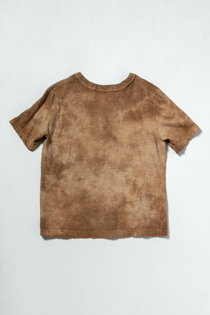 種子を育てるのは土。その土から採れる染料のベンガラ染めを専門に手がける染師の小渕裕さんに染めてもらった生地で作りました。1枚ずつランダムに絞ってムラ染めすることで、土のように複雑で豊かな色が表現されています。ベンガラ染めは、土に含まれる酸化鉄を高温で焼いたものを原料にしていて「鉱物染め」や「土染め」とも呼ばれます。色が褪せずに長く保たれるのが特徴です。