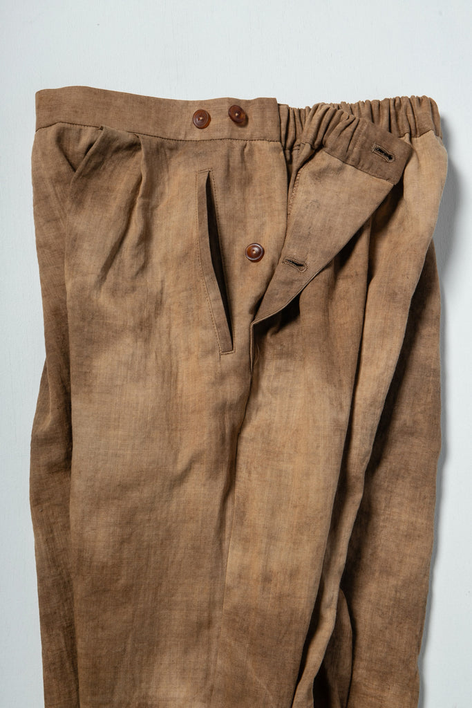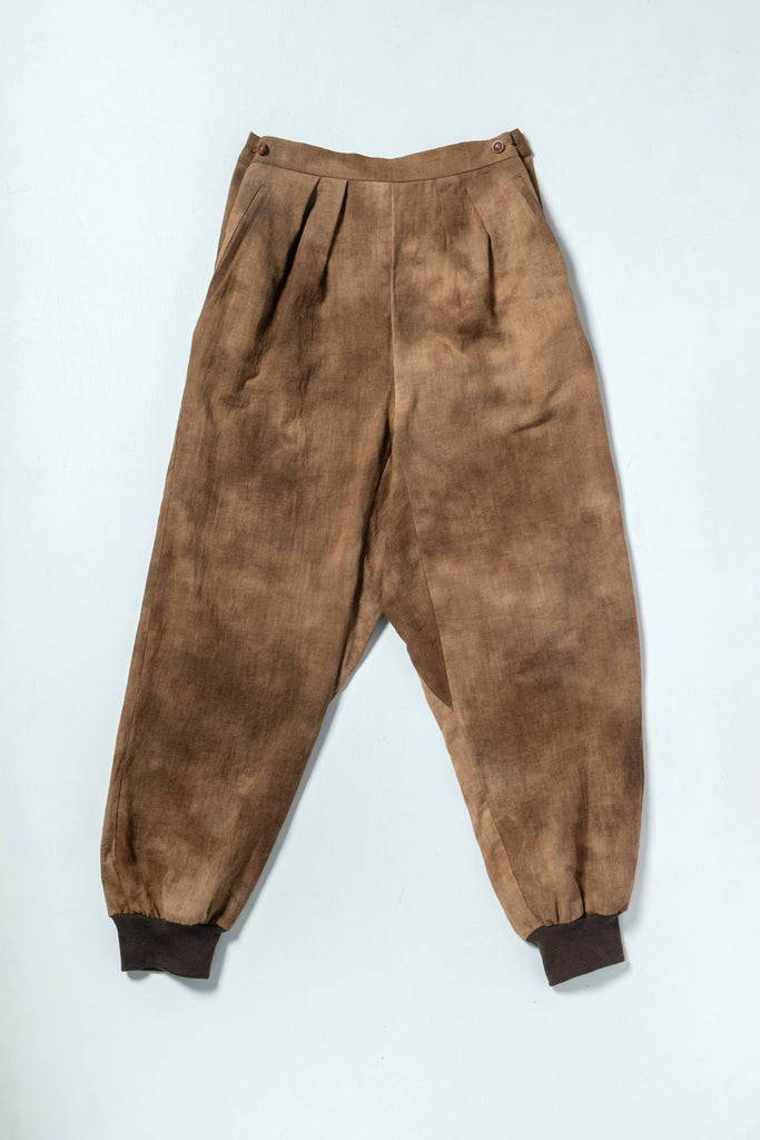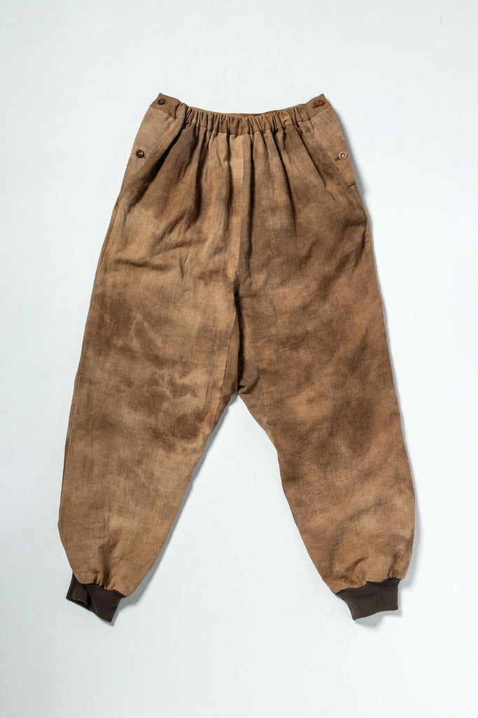 ウエストの両サイドにボタンがふたつついていて調節できるようになっていて、後ろにはゴムが入っています。股上は深く、裾はコットンリブ。腰回りから足首まで楽で安心で心地よいです。