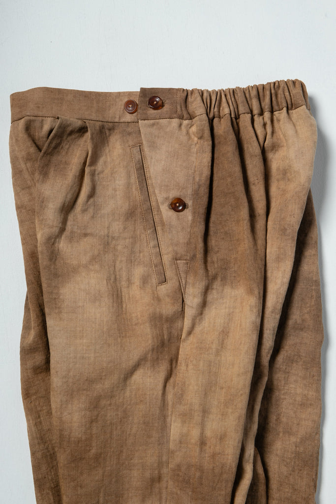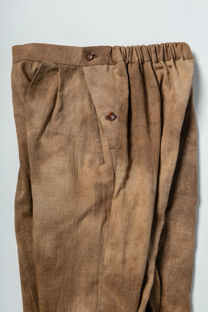 種子を育てるのは土。その土から採れる染料のベンガラ染めを専門に手がける染師の小渕裕さんに染めてもらった生地で作りました。1枚ずつランダムに絞ってムラ染めすることで、土のように複雑で豊かな色が表現されています。ベンガラ染めは、土に含まれる酸化鉄を高温で焼いたものを原料にしていて「鉱物染め」や「土染め」とも呼ばれます。色が褪せずに長く保たれるのが特徴です。