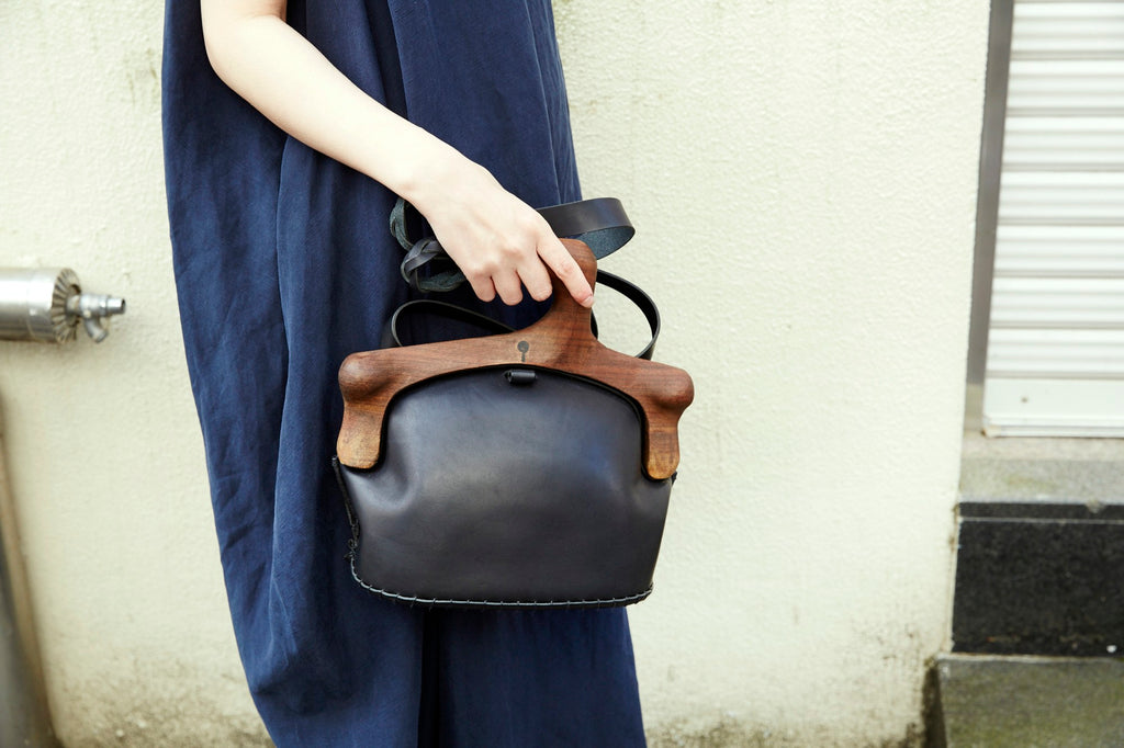 木のハンドルはデザイナー自身が一点ずつ削り、独特の形に仕上げます。天然鞣し革の強度だけで丸みのあるフォルムを成している本体部分は、デザイナーがつくる削り出しの木型を使って型入れすることで生まれています。縫いはすべてハンドステッチ。一つ一つ隅々まで手をかけてつくっています。天然の木と革を使っているので、使い込むほどハンドルにも本体にも艶と味わいが出てきて、どんどん手にも馴染んで、愛着が深まっていくはずです。