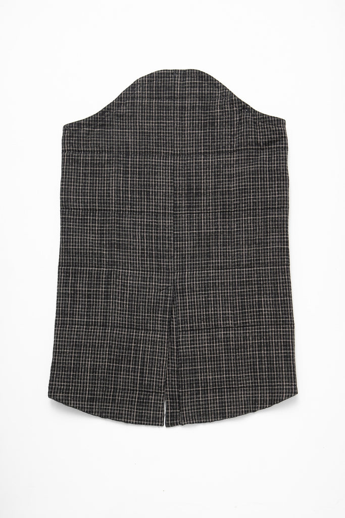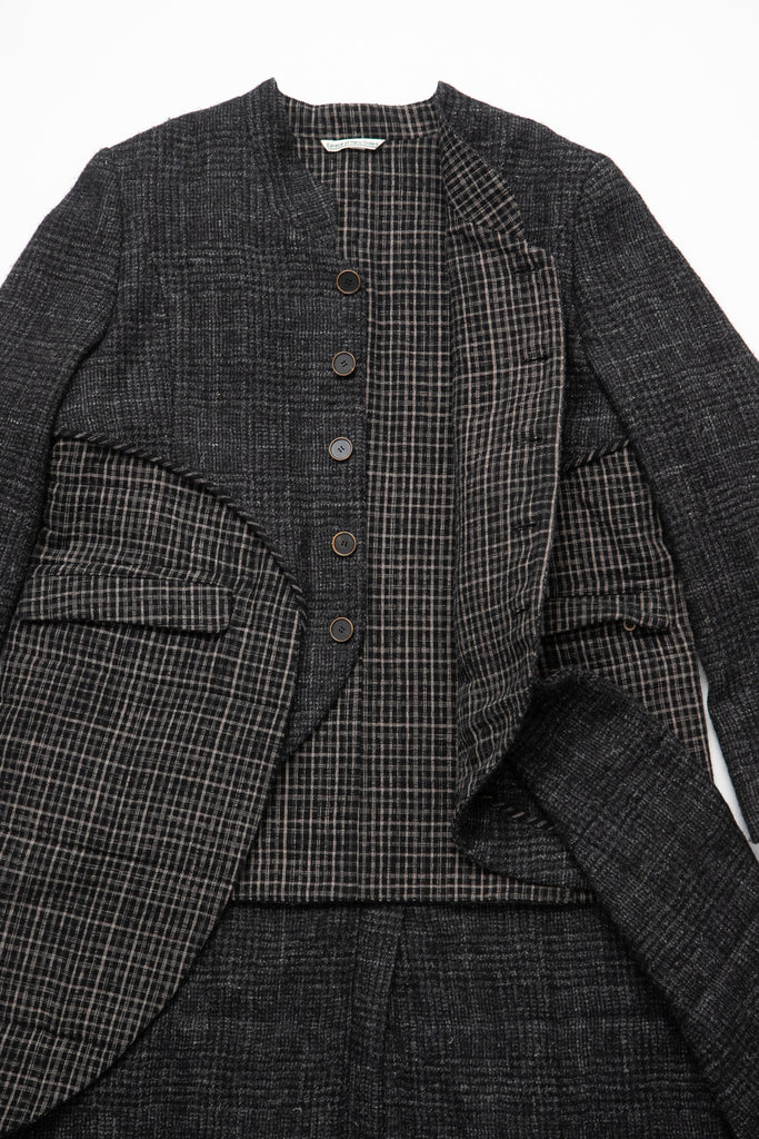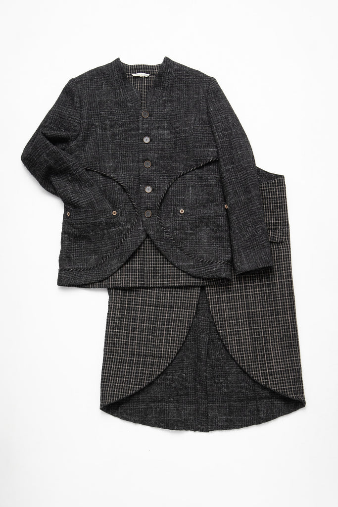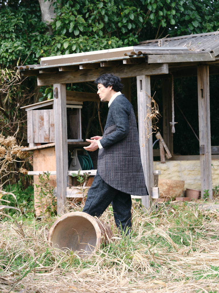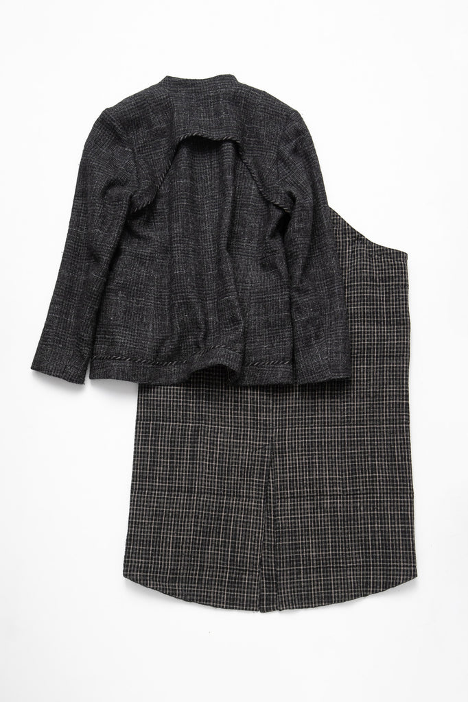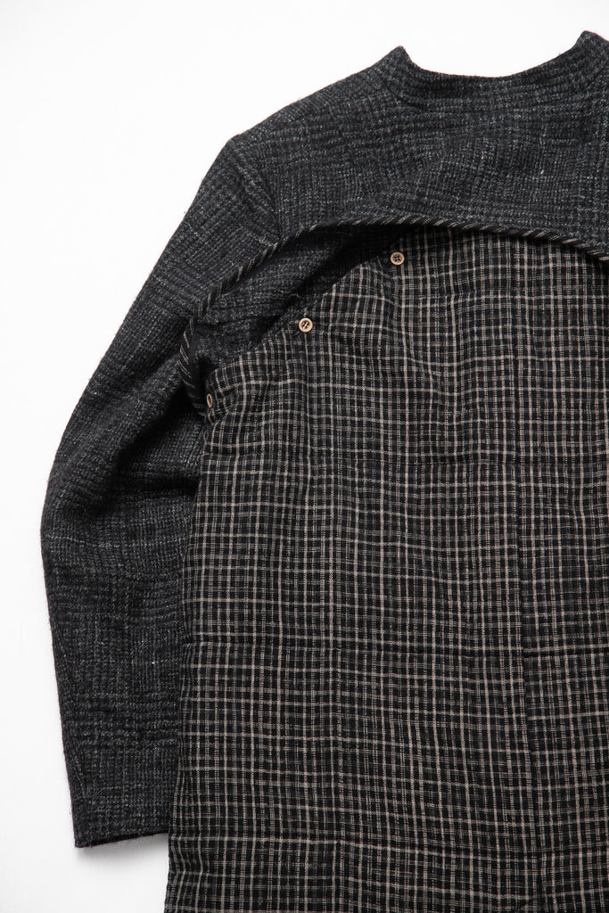 尾州の生地メーカー〈オフィスクニ〉の麻糸を織り交ぜた毛織物と、浜松で遠州織をつくる〈杉浦テキスタイル〉の手織りのようなコットンを組み合わせて使用していて、異なる素材の質感が重なり合って奥行きのある表情が生まれました。