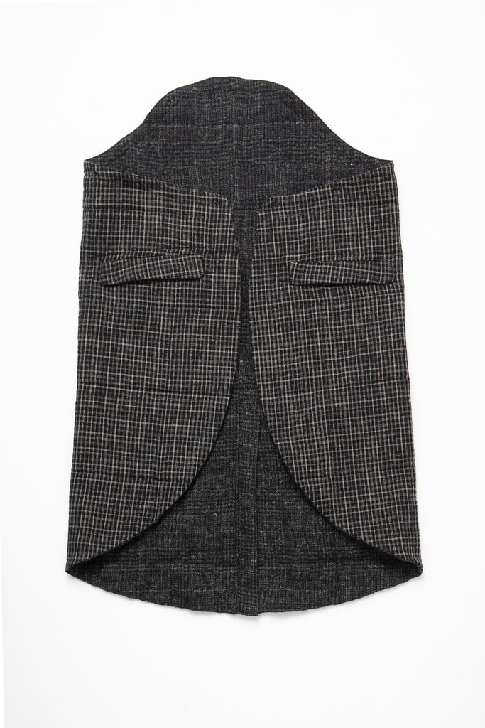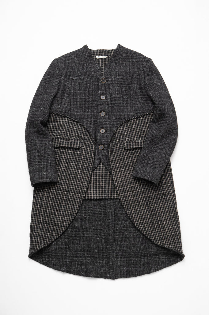 コート部分は、2種類の素材の間に真綿を挟むことで、軽さとあたたかさを両立。取り付けるとジャケットとのコントラストが生まれ、燕尾服のようなシルエットと相まって、唯一無二のコートに変化します。