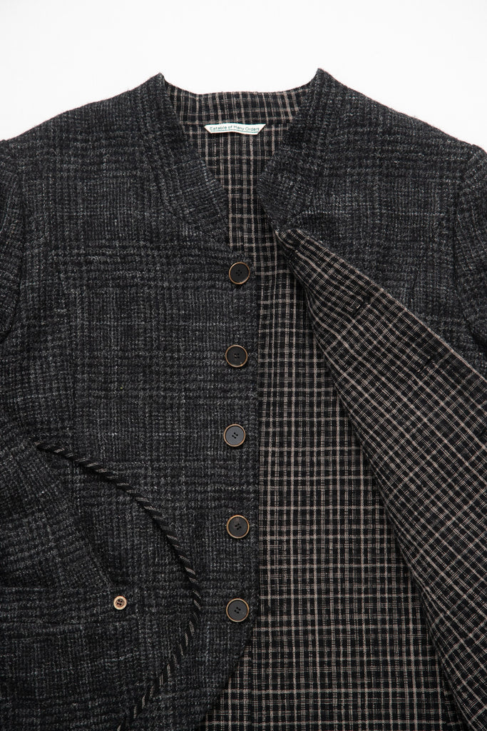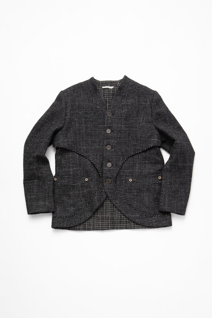 尾州の生地メーカー〈オフィスクニ〉の麻糸を織り交ぜた毛織物と、浜松で遠州織をつくる〈杉浦テキスタイル〉の手織りのようなコットンを組み合わせて使用していて、異なる素材の質感が重なり合って奥行きのある表情が生まれました。