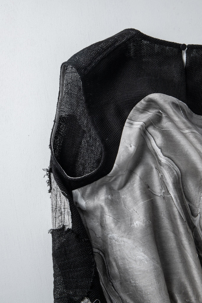背中の表地は全面マーブル染めの生地。背裏には麻のからみ織を使っていて肌に心地良いです。サイドに深めのスリットを入れてさらに風通しを良くして、暑い夏にサラリと着られるように仕上げました。