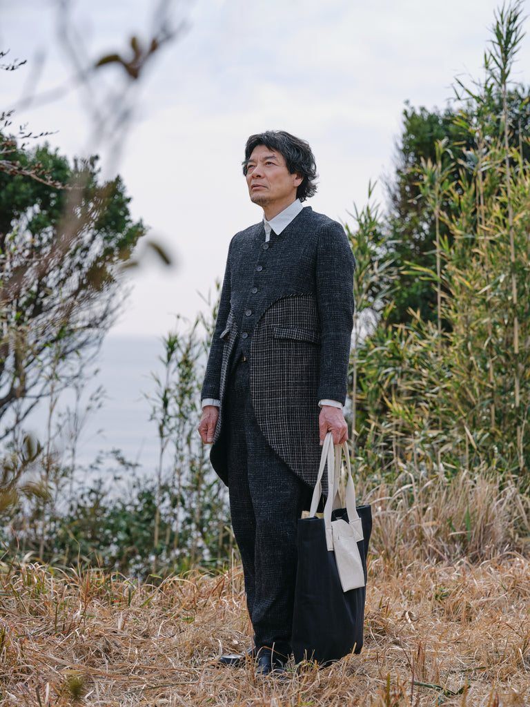 綿ツイル生地で仕立てた正方形の特大トートバッグ。